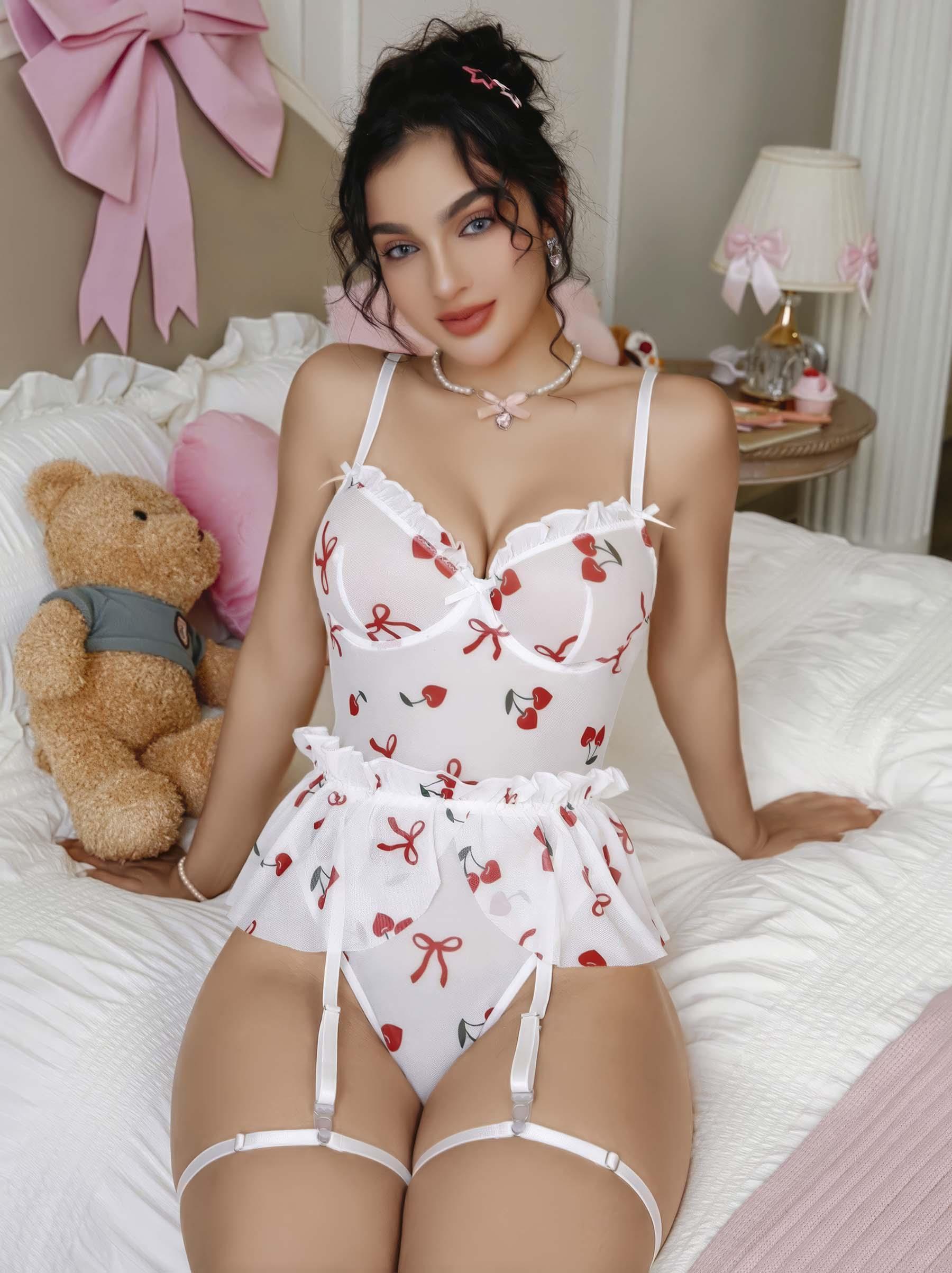 Kadın Beyaz Kiraz Desen Detaylı Fantezi Kostüm 2239