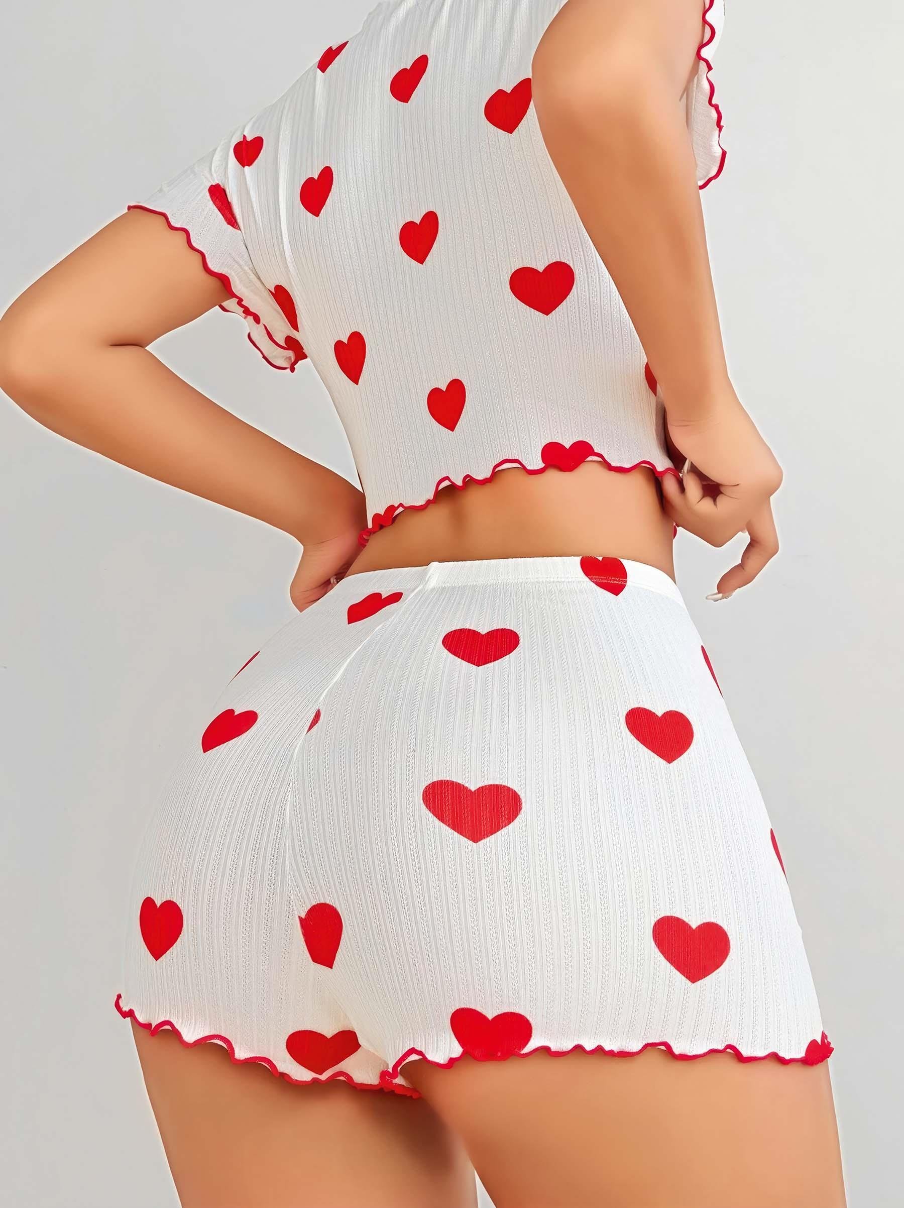 Kadın Beyaz kırmızı kalp Desenli şortlu Gecelik Takım 5023