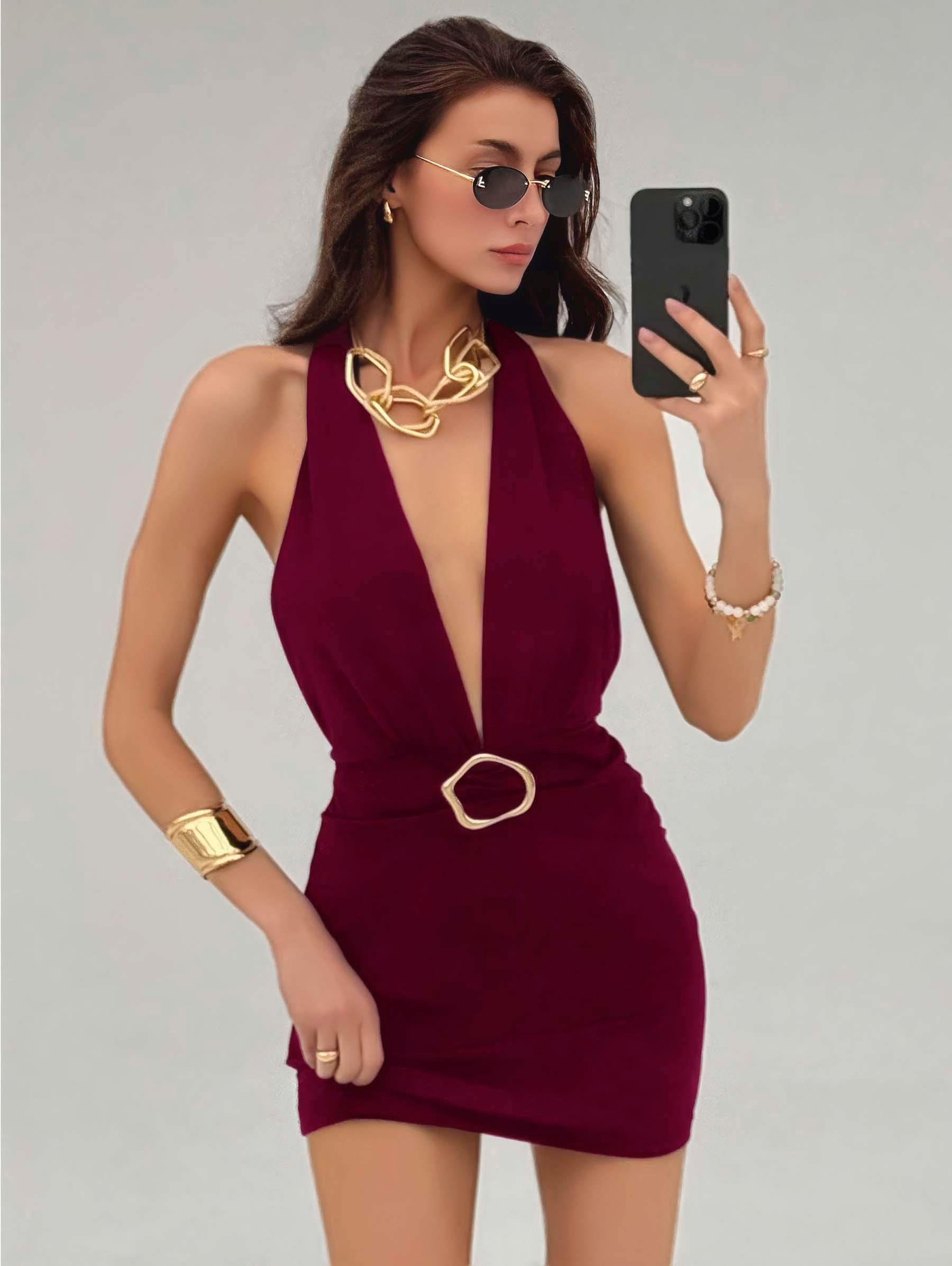 Kadın Bordo Aksesuar Detaylı Boyundan Bağlamalı Şık Tasarım Fantezi Elbise 5140