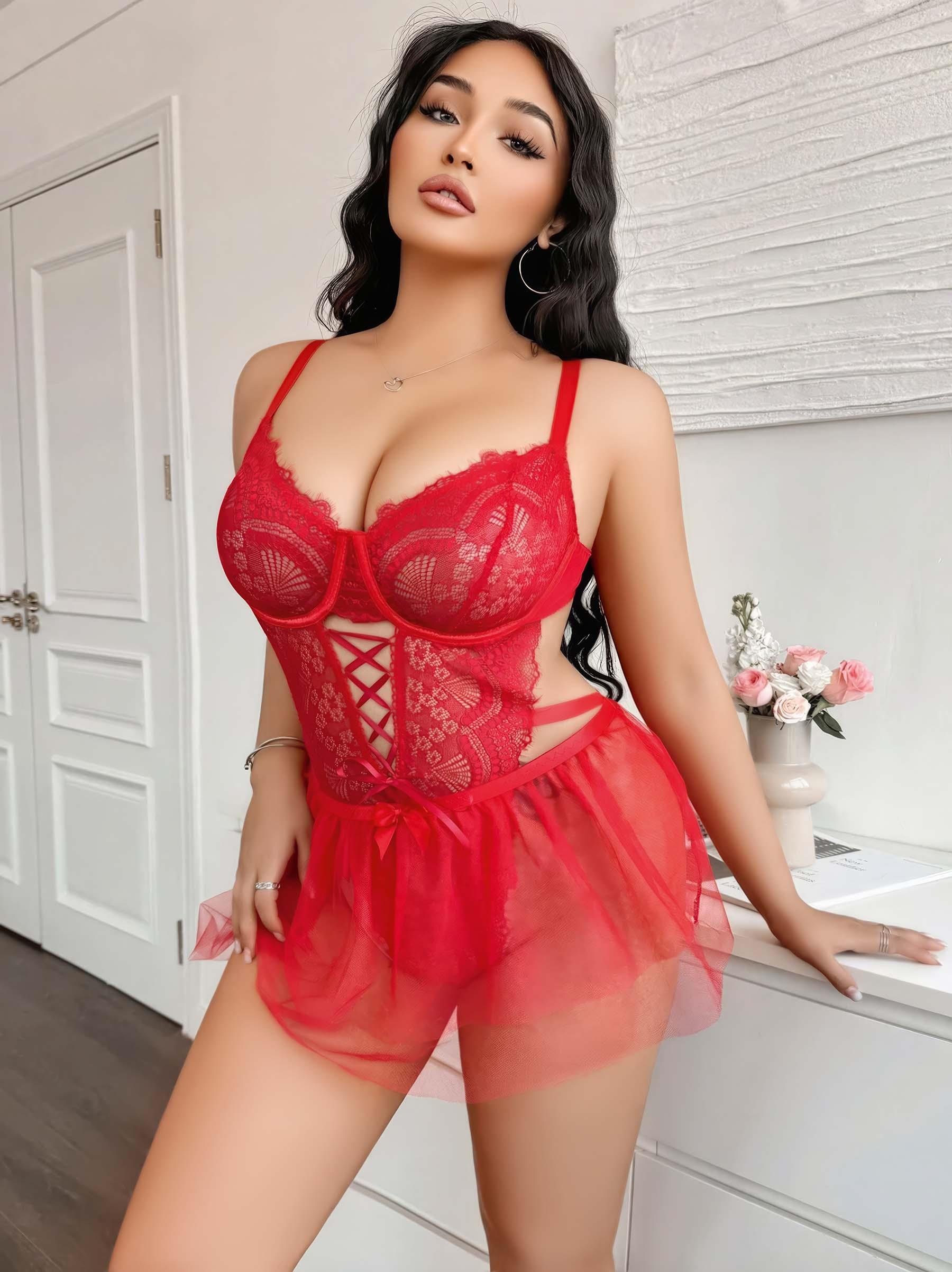 -Kırmızı Dantelli Transparan Fantezi Gecelik Takımı - Kırmızı dantelli tasarımıyla göz alıcı bir görünüm sunar ve şıklığınızı ön plana çıkarır.
