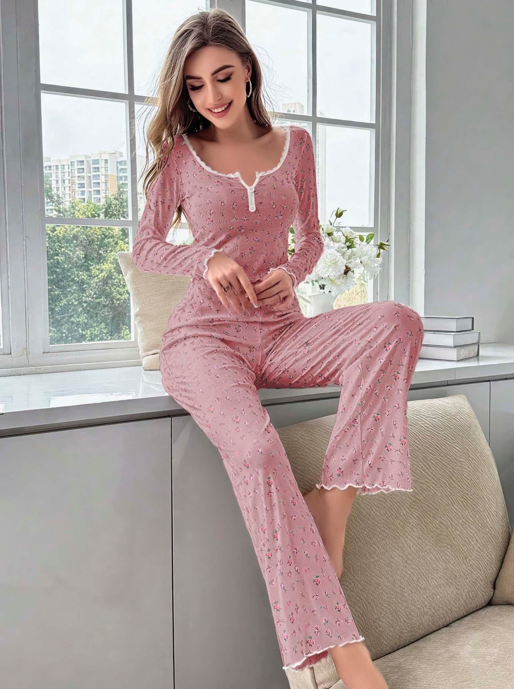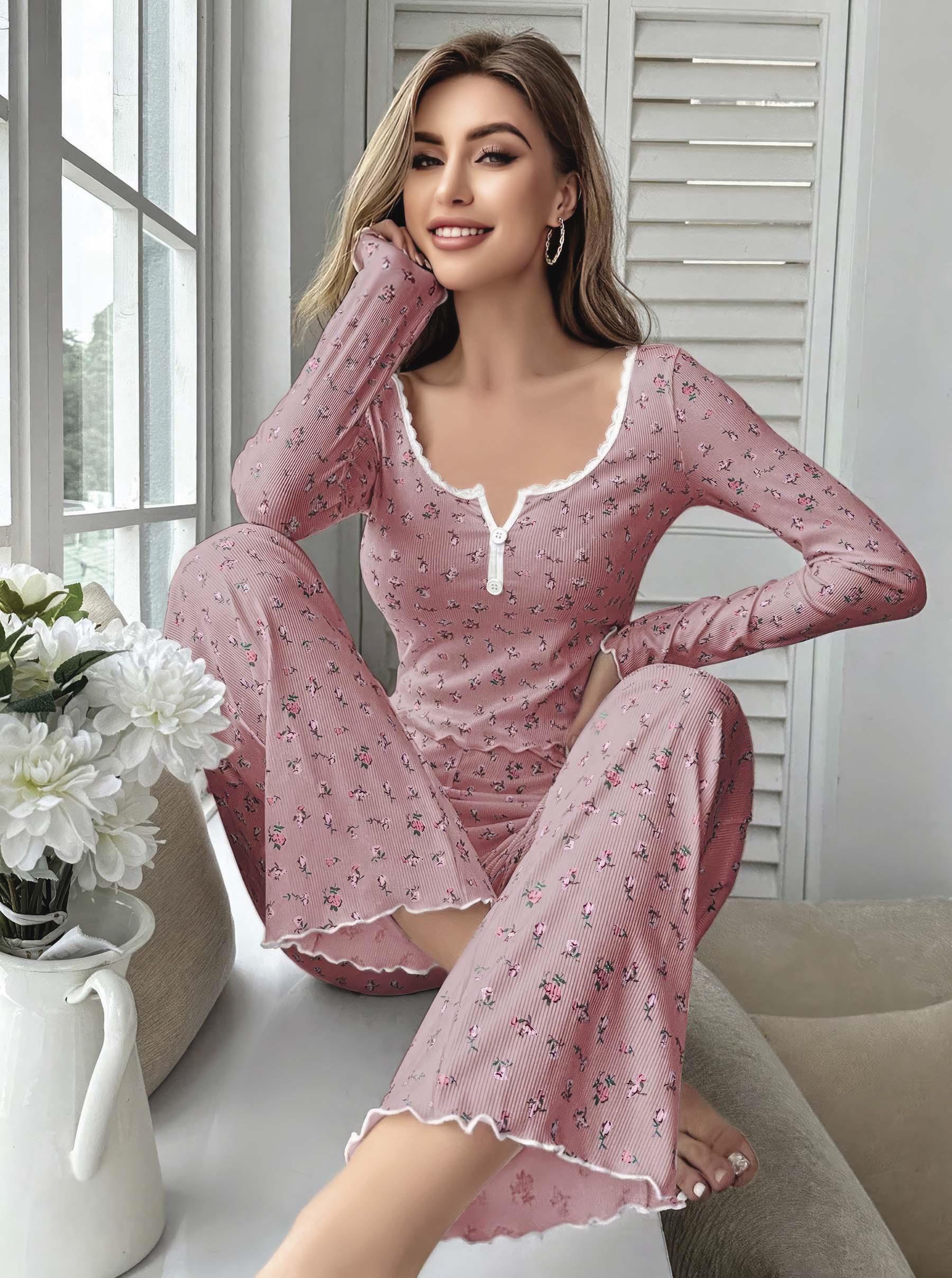 Kadın Çiçek Desenli Yumuşak Pamuklu Uzun Pijama Takımı 5132