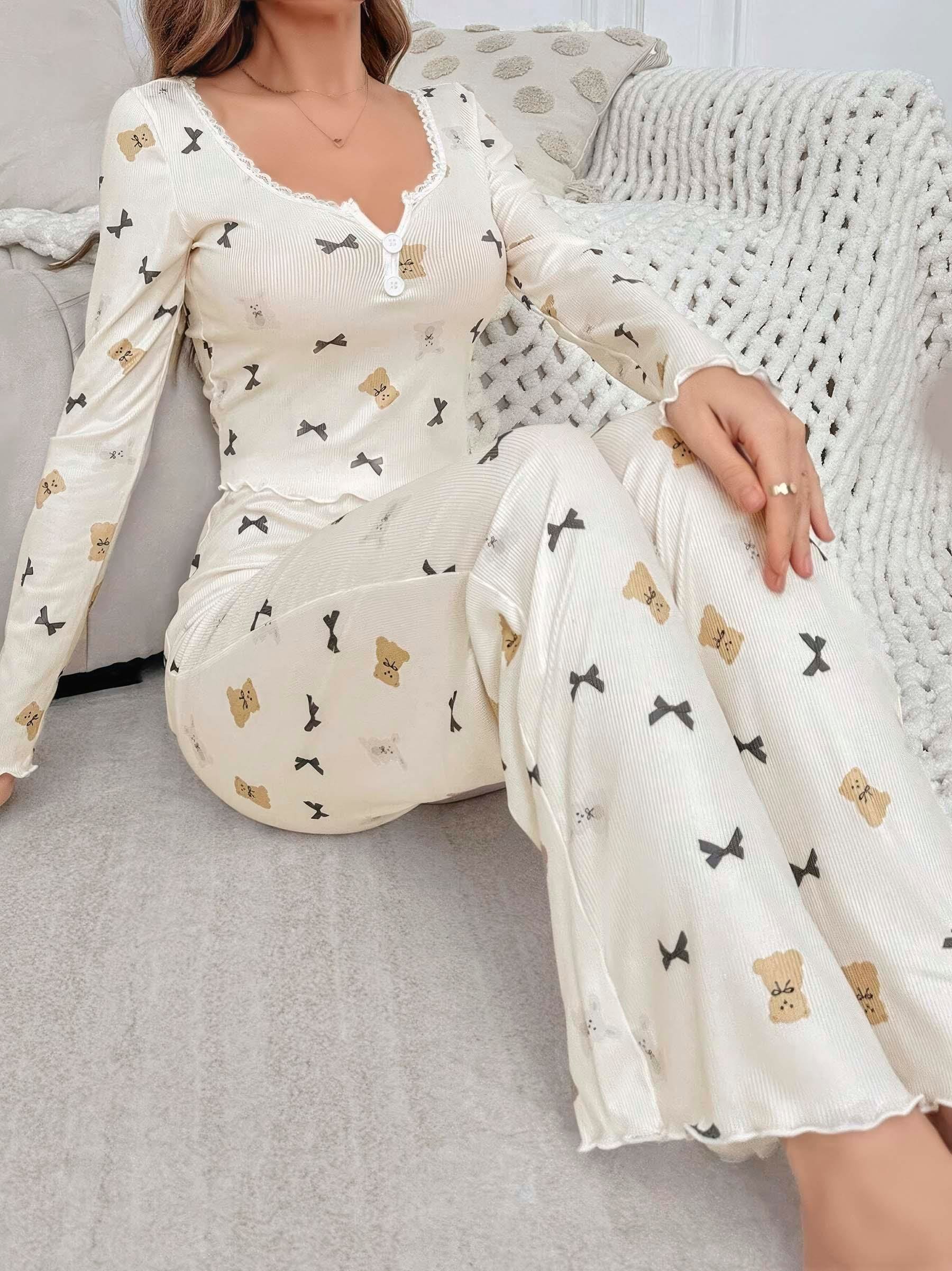 - Desen: Sevimli ayıcık ve zarif fiyonk desenleri, pijama takımına eğlenceli ve çarpıcı bir görünüm kazandırır.